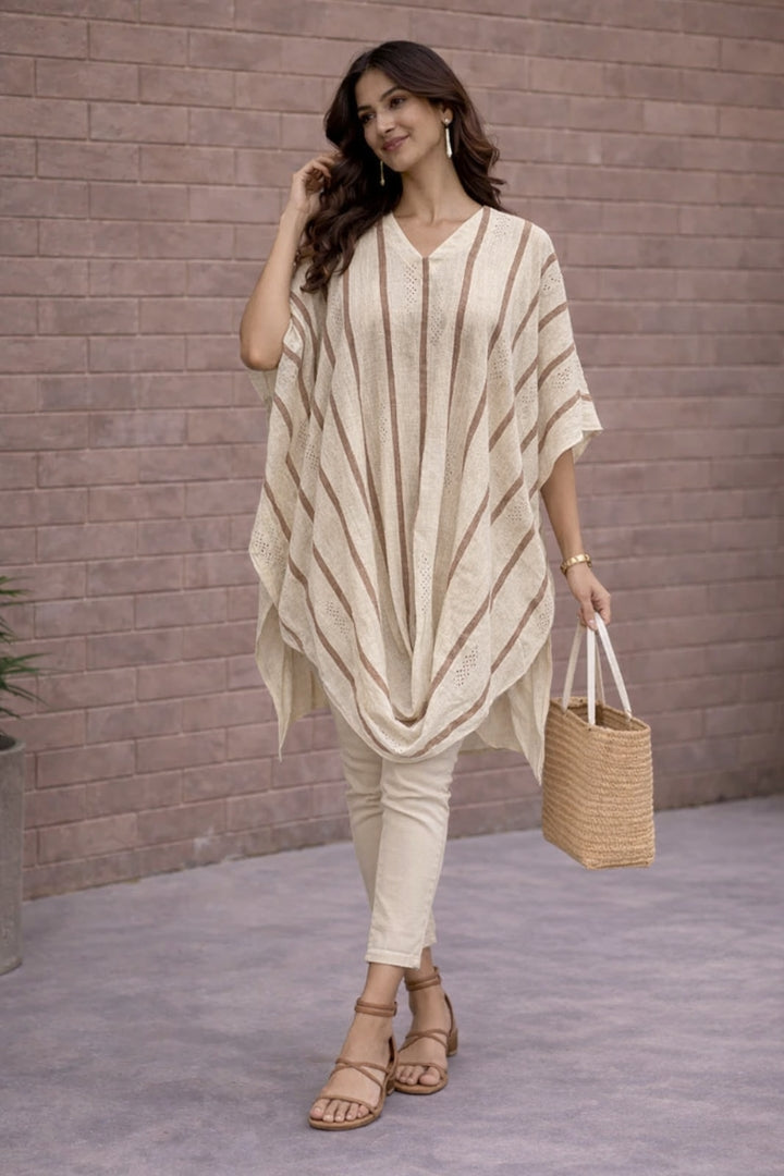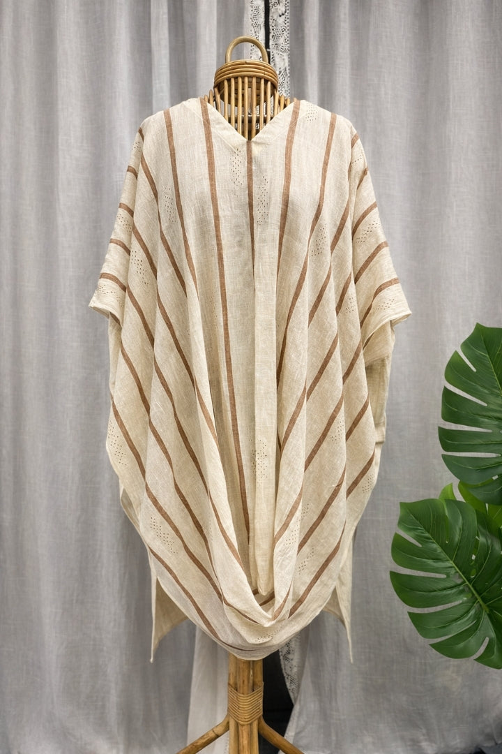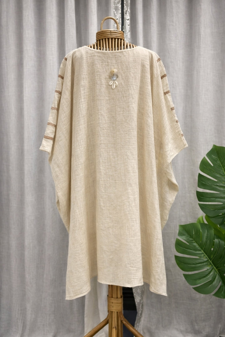 Crafted from handspun Kala cotton, this tunic dress features intri Tangaliya weaving and soft beige stripes. Its relaxed cowl drape silhouette and V-neckline offer effortless elegance and comfort. A delicate shell and feather detail adorns the back, celebrating artisanal craftsmanship. Perfect as a resort wear piece or a statement everyday outfit.