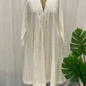 A timeless piece in pure handwoven muslin, this white dress features delicate self-check patterns that add subtle texture and charm. Designed with a deep V-neckline and soft front pleats, it drapes effortlessly, offering comfort and grace. Perfect for daytime elegance or serene evenings, this dress captures the quiet luxury of Indian craftsmanship.