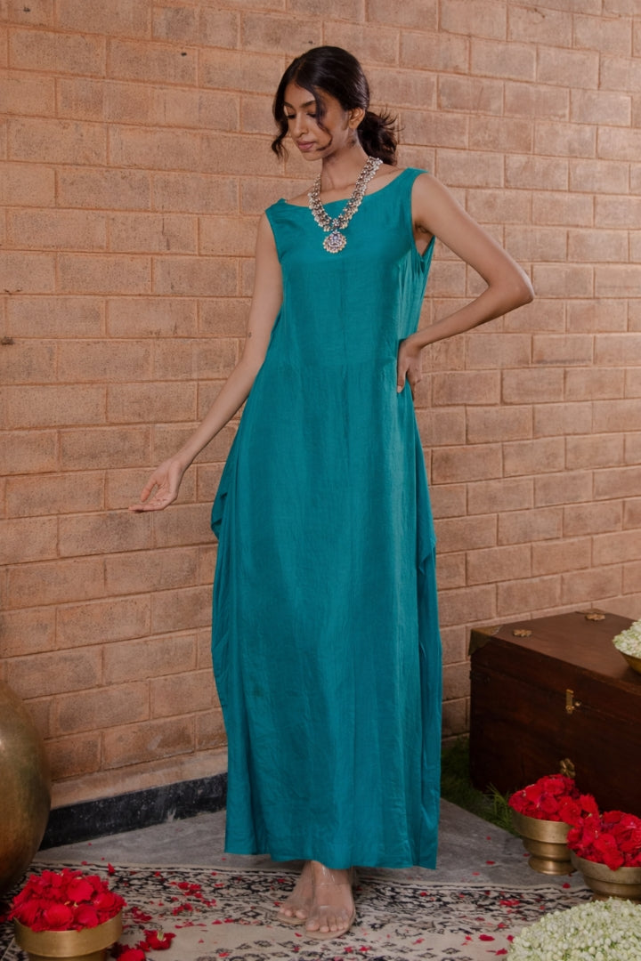 Elevate your evening ensemble with our pure silk long dress, designed for a flattering regular fit. This sophisticated piece features an asymmetric silhouette with a cowl neck at the back and a high neckline, exuding timeless charm and modern allure. It's perfect for dinners and special gatherings, offering effortless elegance and understated style.