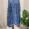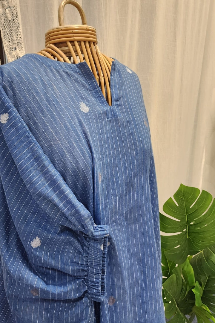A breezy blue co-ord set crafted in fine handwoven muslin jamdani, featuring delicate white buttis and stripes that lend a touch of minimal elegance. The lightweight texture and breathable weave make it a versatile choice for daytime wear, brunch outings, or resort holidays. Designed for contemporary ease while celebrating artisanal weaving traditions, this co-ord blends comfort and style effortlessly.