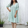 Crafted in the softest handwoven muslin, this mint green dress features delicate checkered weaves that lend it a timeless charm. The tiered silhouette with a relaxed fit, V-neckline, and three-quarter sleeves makes it both comfortable and elegant. Light, breathable, and versatile, it transitions effortlessly from everyday wear to refined gatherings, embodying the ease of heritage fabric in a contemporary form.