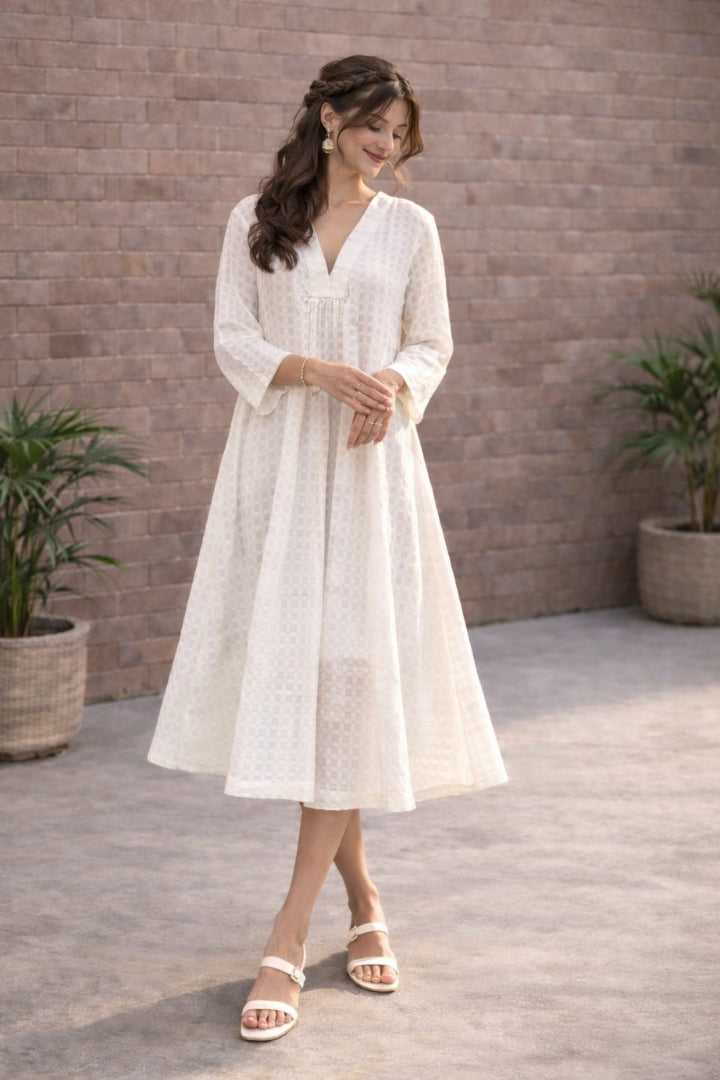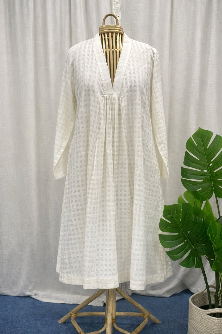 A timeless piece in pure handwoven muslin, this white dress features delicate self-check patterns that add subtle texture and charm. Designed with a deep V-neckline and soft front pleats, it drapes effortlessly, offering comfort and grace. Perfect for daytime elegance or serene evenings, this dress captures the quiet luxury of Indian craftsmanship.