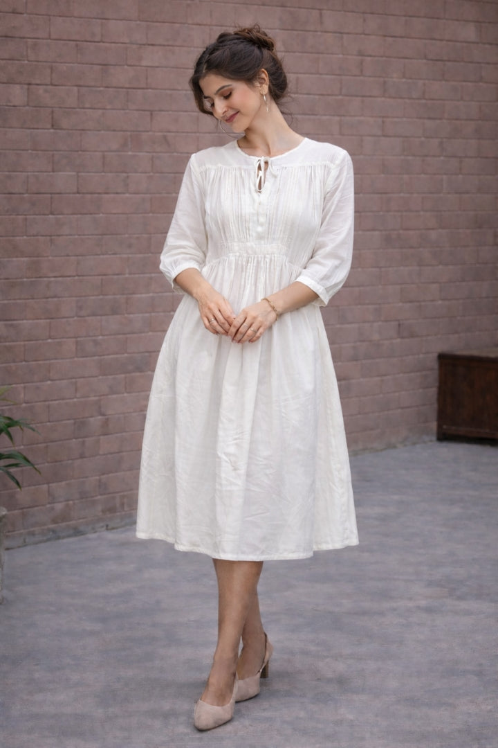 Handwoven White Muslin Midi Dress with Soft Gathers