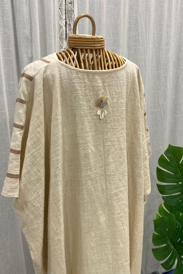 Crafted from handspun Kala cotton, this tunic dress features intri Tangaliya weaving and soft beige stripes. Its relaxed cowl drape silhouette and V-neckline offer effortless elegance and comfort. A delicate shell and feather detail adorns the back, celebrating artisanal craftsmanship. Perfect as a resort wear piece or a statement everyday outfit.