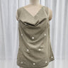 A sophisticated olive green handwoven Jamdani top featuring white woven polka motifs and a soft cowl neckline. Crafted from fine muslin cotton, this sleeveless top offers a fluid drape and effortless comfort. Perfect for pairing with tailored pants or skirts, it’s a versatile choice for both day and evening wear.