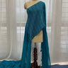 Turquoise Green saree embellished with intricate smocking embroidery across the pallu and upper drape, giving it a textured richness while retaining the airy lightness of muslin. The saree is finished with a delicate Self Border and tassels that add a playful contrast. A striking yet graceful drape, ideal for festive occasions, cultural events, or statement day wear.