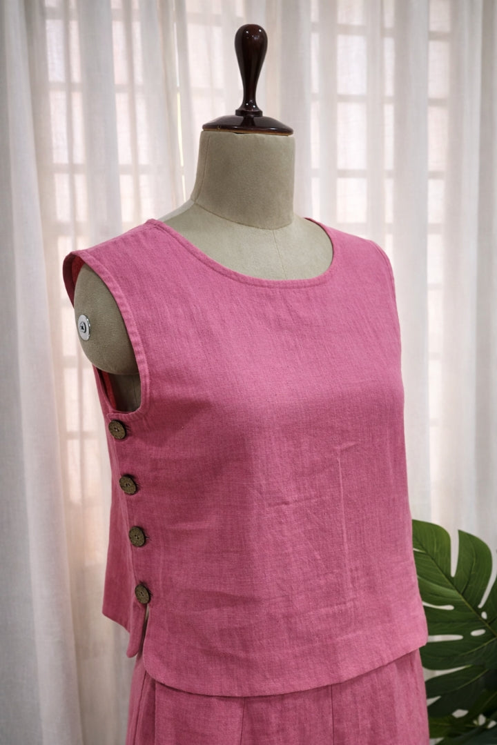 Breezy co-ord set. The top is sleevless khadi that has functional wooden buttons at sides. Bottom is full length with deep pockets.